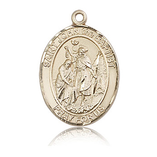 Die struck, hand-engraved St John the Baptist medal is made of polished, solid 14k yellow gold. Inscription: SAINT JOHN THE BAPTIST PRAY FOR US. Dimensions: 1in x 3/4in. This item is the size of a quarter. Made in USA.