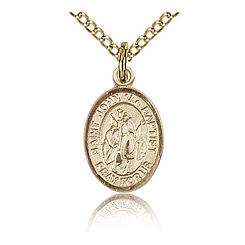 Die struck, hand-engraved St John charm. Free 18-inch gold plated, sterling silver lite curb chain with lobster clasp. Plain back. Dimensions: 1/2in x 1/4in. This item is half the size of a quarter. Made in USA.