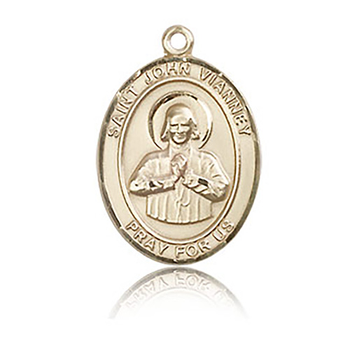 This ladies' 14k yellow gold oval St John Vianney medal is die struck and hand-engraved. Inscription: SAINT JOHN VIANNEY PRAY FOR US. Dimensions: 3/4in x 1/2in. This item is the size of a penny. Made in USA.