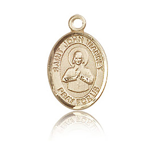 Die struck, hand-engraved medal is made of polished, solid 14kt yellow gold. Inscription: SAINT JOHN VIANNEY PRAY FOR US. Dimensions: 1/2in x 1/4in. This item is half the size of a quarter. Made in USA.