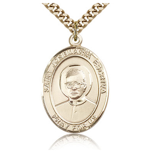 Gold filled sterling silver oval St Josemaria Escriva medal dangles from a 24-inch stainless steel, endless heavy curb chain with gold plating. Die struck, hand-engraved. Inscription: SAINT JOSEMARIA ESCRIVA PRAY FOR US. Dimensions: 1in x 3/4in. This item is the size of a quarter. Made in USA.