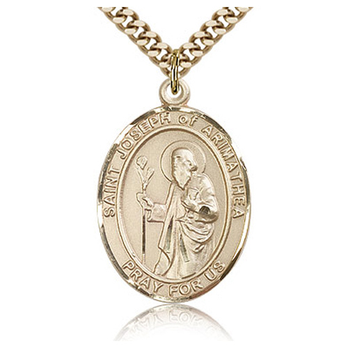 This men's oval St Joseph of Arimathea medal is made of gold filled sterling silver. Die struck, hand-engraved. Inscription: SAINT JOSEPH Of ARIMATHEA PRAY FOR US. 24-inch stainless steel, endless heavy curb chain with gold plating. Dimensions: 1in x 3/4in. This item is the size of a quarter. Made in USA.