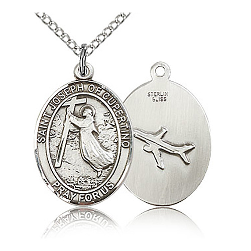 Sterling silver oval St Joseph of Cupertino medal dangles from a 18-inch sterling silver lite curb chain with lobster clasp. Dimensions: 3/4in x 1/2in. Inscription: SAINT JOSEPH OF CUPERTINO PRAY FOR US. This item is the size of a penny. Die struck, hand-engraved medal. Made in USA.