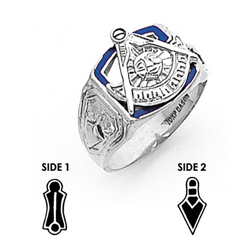 Solid back 14k white gold past master mason ring has a tapered shank. There's a cut out space inside the G. 14k white gold Past Master insignia. Blue enamel border. Plumb bob and trowel side emblems. Standard fit. Made in the USA.