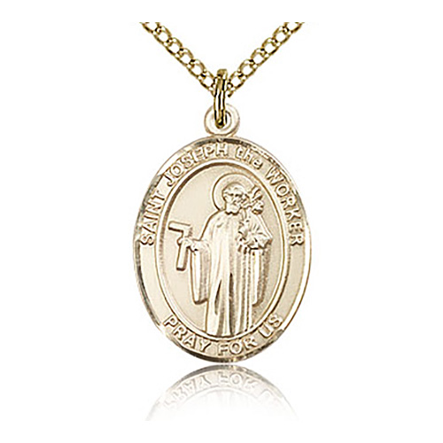 St Joseph the Worker die struck, hand-engraved medal. Inscription: SAINT JOSEPH THE WORKER PRAY FOR US. Free 18-inch sterling silver lite curb chain with lobster clasp. Dimensions: 3/4in x 1/2in. This item is the size of a penny. Made in USA.
