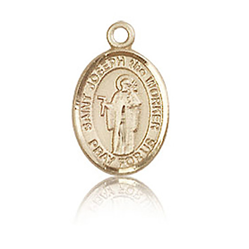 This very small St Joseph the worker medal is made of solid 14k yellow gold. Inscription: SAINT JOSEPH THE WORKER PRAY FOR US. Dimensions: 1/2in x 1/4in. This item is half the size of a quarter. Die struck, hand-engraved. Made in USA.
