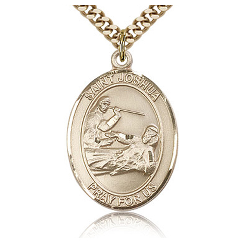 Gold filled sterling silver oval St Joshua medal dangles from a 24-inch stainless steel, endless heavy curb chain with gold plating.Die struck, hand-engraved. Inscription: SAINT JOSHUA PRAY FOR US. Dimensions: 1in x 3/4in. This item is the size of a quarter. Made in USA.