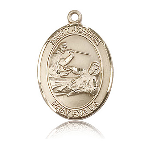Die struck, hand-engraved St Joshua medal is made of polished, solid 14k yellow gold. Inscription: SAINT JOSHUA PRAY FOR US. Dimensions: 1in x 3/4in. This item is the size of a quarter. Made in USA.
