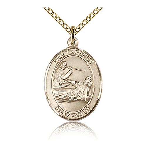 Gold filled oval St Joshua medal dangles from a gold-plated sterling silver 18-inch lite curb chain with lobster clasp. Inscription: SAINT JOSHUA PRAY FOR US. Dimensions: 3/4in x 1/2in. This item is the size of a penny. Die struck, hand-engraved medal. Made in USA.