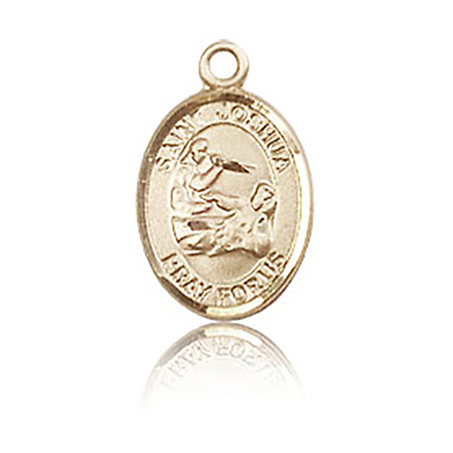 This very small St Joshua medal is made of polished, solid 14k yellow gold. Inscription: SAINT JOSHUA PRAY FOR US. Dimensions: 1/2in x 1/4in. This item is half the size of a quarter. Die struck, hand-engraved. Made in USA.