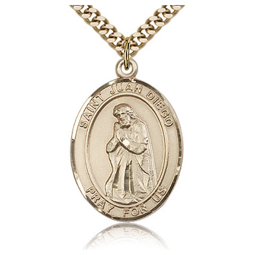 Gold filled sterling silver oval St Juan Diego medal dangles from a 24-inch stainless steel, endless heavy curb chain with gold plating.Die struck, hand-engraved. Inscription: SAINT JUAN DIEGO PRAY FOR US. Dimensions: 1in x 3/4in. This item is the size of a quarter. Made in USA.