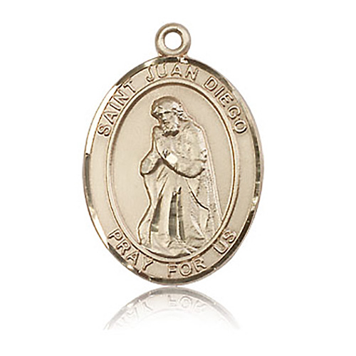 Die struck, hand-engraved medal is made of polished, solid 14kt yellow gold. Inscription: SAINT JUAN DIEGO PRAY FOR US. Dimensions: 1in x 3/4in. This item is the size of a quarter. Made in USA.