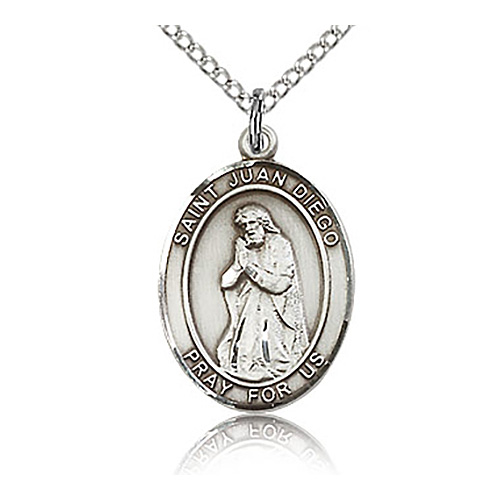 Die struck, hand-engraved medal. Inscription: SAINT JUAN DIEGO PRAY FOR US. Free 18-inch sterling silver lite curb chain with lobster clasp. Dimensions: 3/4in x 1/2in. This item is the size of a penny. Made in USA.
