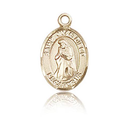 This very small oval St Juan Diego medal is made of polished, solid 14k yellow gold. Inscription: SAINT JUAN DIEGO PRAY FOR US. Dimensions: 1/2in x 1/4in. This item is half the size of a quarter. Made in USA.