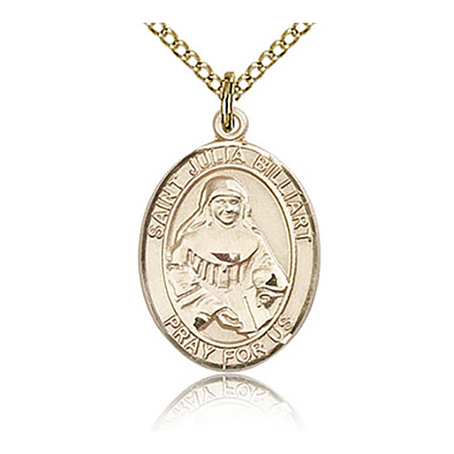 Gold filled oval St Julia Billiart medal dangles from a gold-plated sterling silver 18-inch lite curb chain with lobster clasp. Inscription: SAINT JULIA BILLIART PRAY FOR US. Dimensions: 3/4in x 1/2in. This item is the size of a penny. Made in USA.