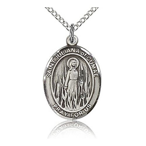 This oval St Juliana medal is made of antiqued sterling silver. Inscription: SAINT JULIANA PRAY FOR US. 18-inch sterling silver lite curb chain with lobster clasp. Dimensions: 3/4in x 1/2in. This item is the size of a penny. Die struck, hand-engraved Made in USA.