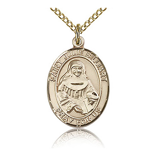 Gold filled oval St Julie Billiart medal dangles from a gold-plated sterling silver 18-inch curb chain with lobster clasp. Inscription: SAINT JULIE BILLIART PRAY FOR US. Dimensions: 3/4in x 1/2in. This item is the size of a penny. Made in USA.