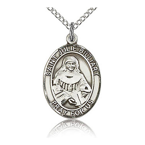 Die struck, hand-engraved medal. Inscription: SAINT JULIE BILLIART PRAY FOR US. 18-inch sterling silver lite curb chain has a lobster clasp. Dimensions: 3/4in x 1/2in. This item is the size of a penny. Made in USA.