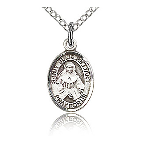 This very small St Julie Billiard charm dangles from a sterling silver 18-inch lite curb chain with lobster clasp. Plain back. Dimensions: 1/2in x 1/4in. This item is half the size of a quarter. Die struck, hand-engraved. Made in USA.