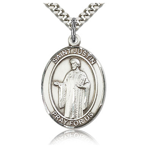 Die struck, hand-engraved medal. Inscription: SAINT JUSTIN PRAY FOR US. Free 24-inch stainless steel, endless heavy curb chain with silver plating. Dimensions: 1in x 3/4in. This item is the size of a quarter. Made in USA.