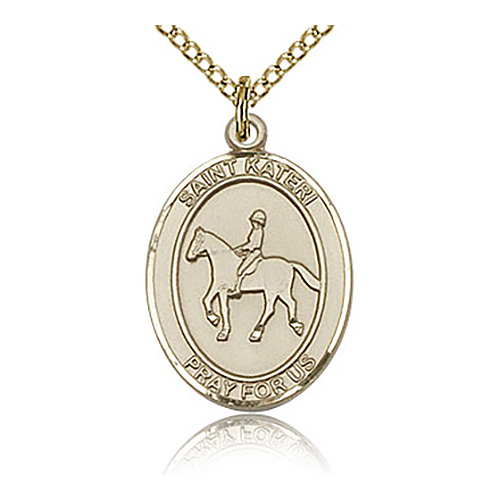 Gold filled oval St Kateri medal dangles from a gold-plated sterling silver lite 18-inch curb chain with lobster clasp. Dimensions: 3/4in x 1/2in. This item is the size of a penny. Inscription: SAINT KATERI PRAY FOR US. Die struck, hand-engraved. Made in USA.