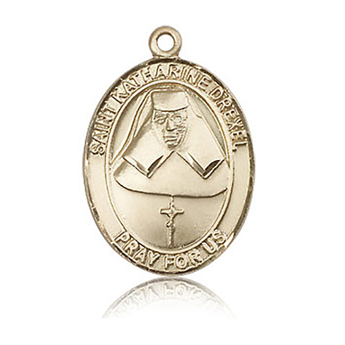 Die struck, hand-engraved medal is made of polished, solid 14kt yellow gold. Inscription: SAINT KATHARINE DREXEL PRAY FOR US. Dimensions: 1in x 3/4in. This item is the size of a quarter. Made in USA.
