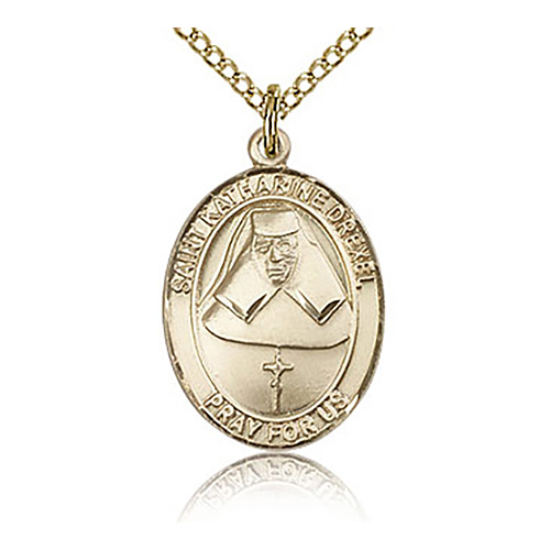 Gold filled oval St Katharine Drexel medal dangles from a gold-plated sterling silver 18-inch curb chain with lobster clasp. Inscription: SAINT KATHARINE DREXEL PRAY FOR US. Dimensions: 3/4in x 1/2in. This item is the size of a penny. Made in USA.