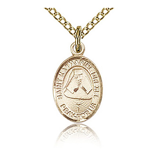 This very small St Katharine Drexel charm necklace is made of gold filled sterling silver. Gold plated, sterling silver 18-inch lite curb chain has a lobster clasp. Plain back. Dimensions: 1/2in x 1/4in. This item is half the size of a quarter. Die struck, hand-engraved. Made in USA.