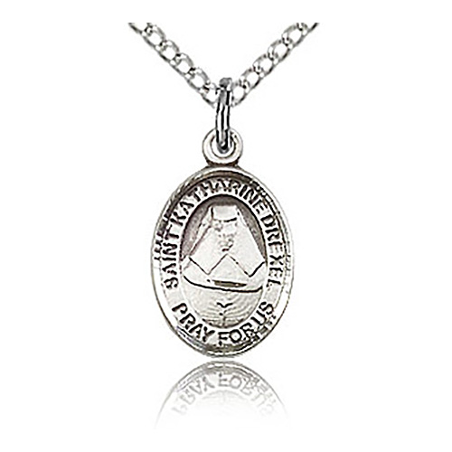 This very small oval St Katharine Drexel charm is made of sterling silver. 18-inch sterling silver lite curb chain with lobster clasp. Plain back. Dimensions: 1/2in x 1/4in. This item is half the size of a quarter. Made in USA.