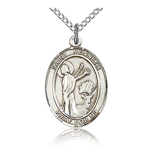 Sterling silver oval St Kenneth medal has the inscription: SAINT KENNETH PRAY FOR US. 18-inch sterling silver lite curb chain with lobster clasp. Dimensions: 3/4in x 1/2in. This item is the size of a penny. Die struck, hand-engraved. Made in USA.