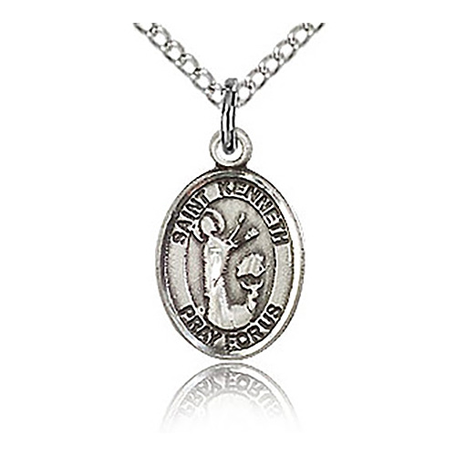 Die struck, hand-engraved St Kenneth charm. Free 18-inch sterling silver lite curb chain with lobster clasp. Plain back. Dimensions: 1/2in x 1/4in. This item is half the size of a quarter. Made in USA.
