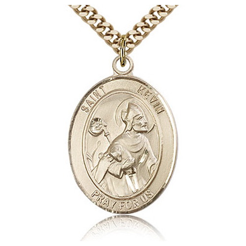 Die struck, hand-engraved medal. Inscription: SAINT KEVIN PRAY FOR US. Free 24-inch stainless steel, endless heavy curb chain with gold plating. Dimensions: 1in x 3/4in. This item is the size of a quarter. Made in USA.