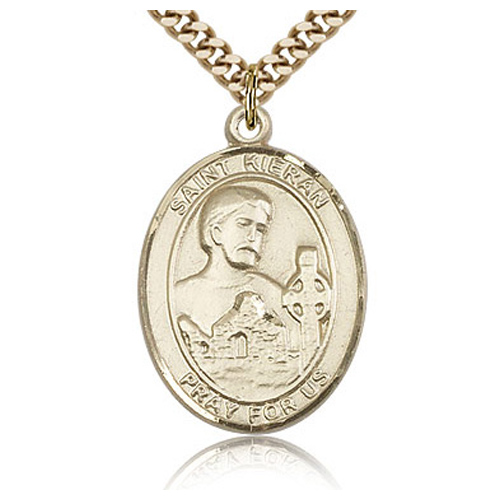 Gold filled sterling silver oval St Kieran medal dangles from a 24-inch stainless steel, endless heavy curb chain with gold plating. Die struck, hand-engraved. Inscription: SAINT KIERAN PRAY FOR US. Dimensions: 1in x 3/4in. This item is the size of a quarter. Made in USA.