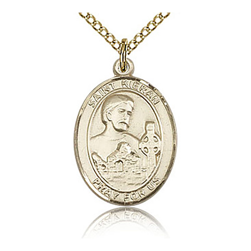 Die struck, hand-engraved medal. Inscription: SAINT KIERAN PRAY FOR US. Free 18-inch sterling silver lite curb chain with lobster clasp. Dimensions: 3/4in x 1/2in. This item is the size of a penny. Made in USA.