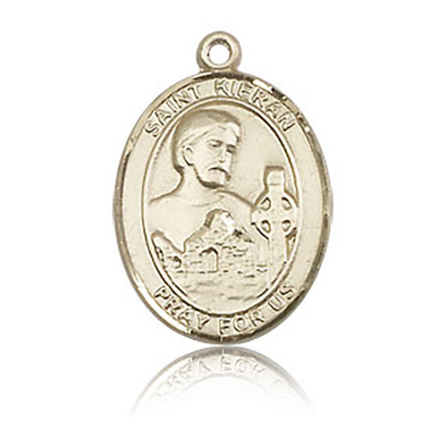 Die struck, hand-engraved medal is made of polished, solid 14kt yellow gold. Inscription: SAINT KIERAN PRAY FOR US. Dimensions: 3/4in x 1/2in. This item is the size of a penny. Made in USA.