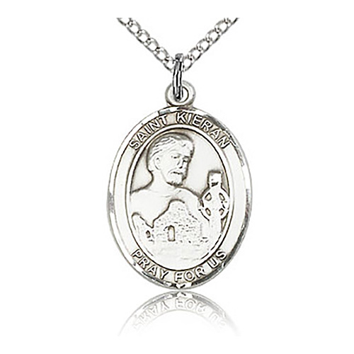 Sterling silver oval St Kieran medal dangles from a sterling silver 18-inch lite curb chain with lobster clasp. Dimensions: 3/4in x 1/2in. This item is the size of a penny. Inscription: SAINT KIERAN PRAY FOR US. Die struck, hand-engraved medal. Made in USA.