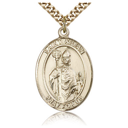 Die struck, hand-engraved medal. Inscription: SAINT KILIAN PRAY FOR US. Free 24-inch stainless steel, endless heavy curb chain with gold plating. Dimensions: 1in x 3/4in. This item is the size of a quarter. Made in USA.