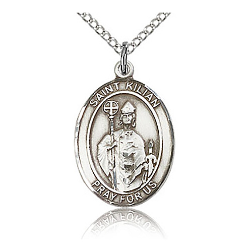 This ladies' oval St Kilian medal is made of solid sterling silver. Inscription: SAINT KILIAN PRAY FOR US. 18-inch sterling silver lite curb chain with lobster clasp. Dimensions: 3/4in x 1/2in. This item is the size of a penny. Die struck, hand-engraved. Made in USA.