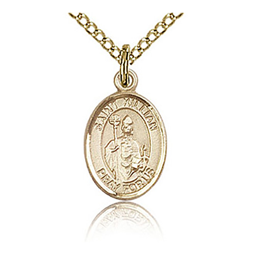 Die struck, hand-engraved St Kilian charm is made of gold filled sterling silver. 18-inch gold plated, sterling silver lite curb chain with lobster clasp. Plain back. Dimensions: 1/2in x 1/4in. This item is half the size of a quarter. Made in USA.