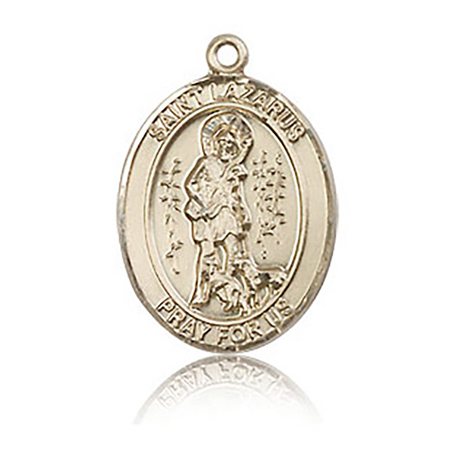 Die struck, hand-engraved St Lazarus medal is made of polished, solid 14k yellow gold. Inscription: SAINT LAZARUS PRAY FOR US. Dimensions: 3/4in x 1/2in. This item is the size of a penny. Made in USA.