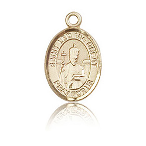 This very small oval Saint Leo the Great charm is made of polished 14k yellow gold. Inscription: SAINT LEO THE GREAT PRAY FOR US. Dimensions: 1/2in x 1/4in. This item is half the size of a quarter. Die struck, hand-engraved medal is made of polished. Made in USA.