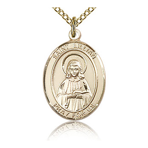 Gold filled oval St Lillian medal dangles from a gold-plated sterling silver 18-inch curb chain with lobster clasp. Inscription: SAINT LILLIAN PRAY FOR US. Dimensions: 3/4in x 1/2in. This item is the size of a penny. Made in USA.