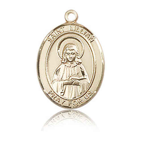 This ladies' 14k yellow gold oval St Lillian medal is die struck and hand-engraved. Inscription: SAINT LILLIAN PRAY FOR US. Dimensions: 3/4in x 1/2in. This item is the size of a penny. Made in USA.