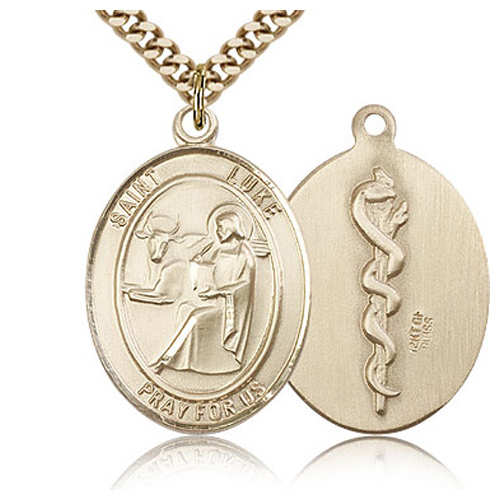 This reversible oval St Luke doctor medal is made of gold filled sterling silver. Inscription: SAINT LUKE PRAY FOR US. 24-inch stainless steel, endless heavy curb chain with gold plating. The back of the medal has a caduceus. Dimensions: 1in x 3/4in. This item is the size of a quarter. Die struck, hand-engraved. Made in USA.