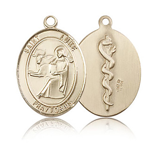St Luke the Apostle die struck, 3/4 inch hand-engraved medal is made of polished, solid 14kt yellow gold. Inscription: SAINT LUKE PRAY FOR US. Dimensions: 3/4in x 1/2in. This item is the size of a penny. Made in USA.
