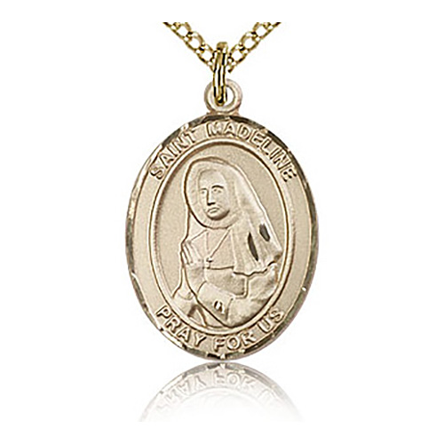 Gold filled oval St Madeline medal dangles from a gold-plated sterling silver 18-inch curb chain with lobster clasp. Inscription: SAINT MADELINE PRAY FOR US. Dimensions: 3/4in x 1/2in. This item is the size of a penny. Made in USA.