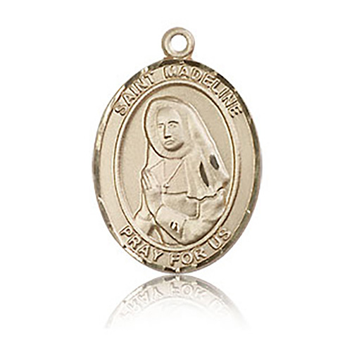 This ladies' 14k yellow gold oval St Madeline medal is die struck and hand-engraved. Inscription: SAINT MADELINE PRAY FOR US. Dimensions: 3/4in x 1/2in. This item is the size of a penny. Made in USA.