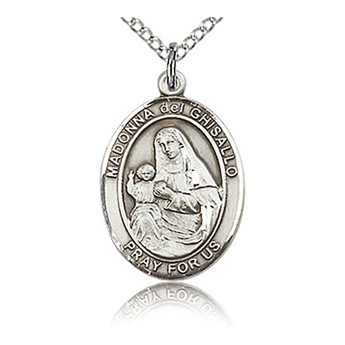 This sterling silver oval St Madonna Del Ghisallo medal dangles from a sterling silver 18-inch lite curb chain. Dimensions: 3/4in x 1/2in. This item is the size of a penny. Inscription: SAINT MADONNA del GHISALLO PRAY FOR US. Die struck, hand-engraved. Made in USA.