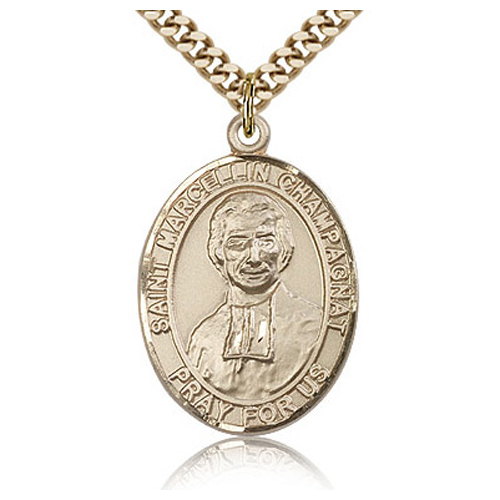 Die struck, hand-engraved medal. Inscription: SAINT MARCELLIN CHAMPAGNAT PRAY FOR US. 24-inch stainless steel, endless heavy curb chain with gold plating. Dimensions: 1in x 3/4in. This item is the size of a quarter. Made in USA.