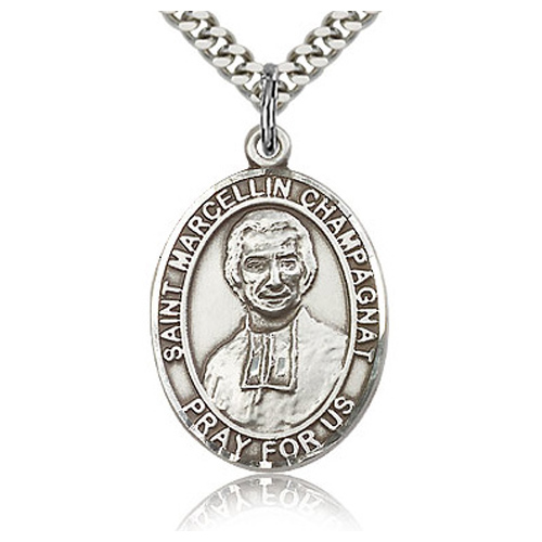The St Marcellin Champagnat medal is made of polished sterling silver. 24-inch stainless steel, endless heavy curb chain with silver plating. Dimensions: 1in x 3/4in. This item is the size of a quarter. Inscription: SAINT MARCELLIN CHAMPAGNAT PRAY FOR US. Die struck, hand-engraved medal. Made in USA.